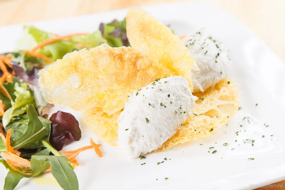 Risotto alle erbette mantecato al buche de chevre, cruditè di scampi e polline